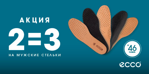 • В период проведения Акции (с 18 июня 2019 года по 31 августа 2019 года) при единовременном заказе трех любых мужских стелек (включая стельки, продающиеся со сниженной ценой) 46 и выше размера (далее – «Акционный товар»), с указанием промокода «2=3», покупателю предоставляется скидка 30% на все Акционные товары в одном заказе. Без указания промокода настоящей Акции скидка не предоставляется. Промокод Акции «2=3» является многоразовым и доступен для использования неограниченное количество раз в период проведения Акции. Количество Акционных товаров ограничено.