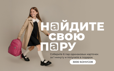 1. Акция «Найдите свою пару» доступна для авторизованных на сайте www.ecco.ru пользователей в период с 19.08.2025 по 31.08.2025. В рамках акции за первое успешное прохождение игры «Найдите свою пару» клиент получает 3000 экстра-бонусов в программе лояльности «ЕССО Moments».