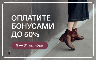 1. В период проведения Акции с 09 по 31 октября 2025 г. участники программы ECCO Moments могут оплатить бонусами 40%, 50% от первоначальной стоимости товаров при покупке избранных товаров категории «Обувь» и/или «Аксессуары» в интернет-магазине www.ecco.ru, фирменных розничных магазинах ЕССО (ООО «ЭККО-РОС»), включая форматы «Дисконт» и «Аутлет». В акции участвуют только товары из акционного списка. Размер скидки зависит от ассортимента, возможные номиналы: 40%, 50%