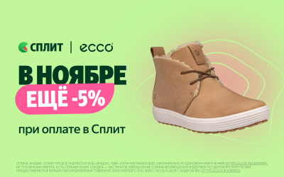 1. В период проведения Акции с 06 ноября по 31 декабря 2025 г. при оформлении покупки на сайте www.ecco.ru или розничном магазине ECCO покупатель получает дополнительную скидку 5% на весь заказ при выборе способа оплаты «Яндекс.Сплит». Дополнительная скидка 5% рассчитывается и предоставляется при переходе на страницу оплаты в виджете «Яндекс.Пэй» и не отображается в кассовой системе ЕССО (ООО «ЭККО-РОС»).