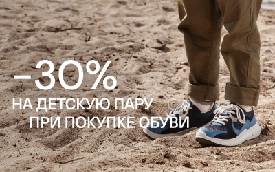 1. В период проведения Акции с 13 по 20 апреля 2026 г. при единовременной покупке в интернет-магазине www.ecco.ru и в розничных магазинах ECCO (ООО «ЭККО-РОС»), за исключением магазинов форматов «Дисконт» и «Аутлет» не менее одной пары любого товара из категории «Обувь» и не менее одного товара из выделенного ассортимента категории «Обувь» (далее – «Детская обувь»), совместно именуемые – «Акционные товары», покупателю предоставляется скидка в размере 30% от каждого товара из категории «Детская обувь», которая автоматически распределяется пропорционально стоимости каждого товара в чеке.