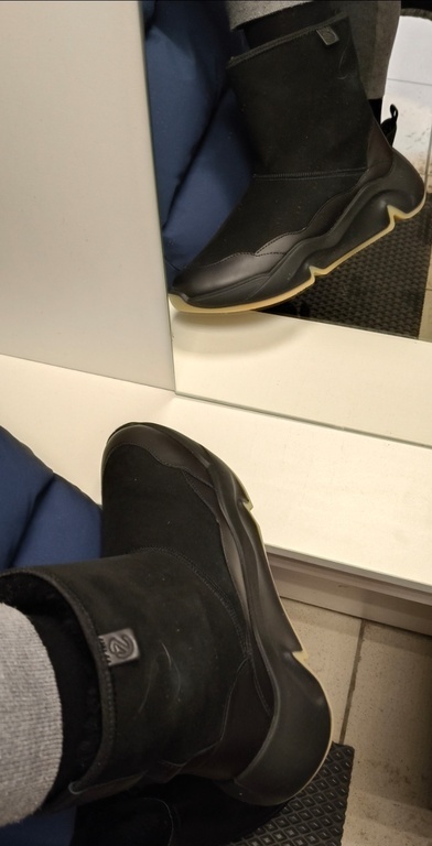 Очень люблю качество Ecco. Заказала 4 пары на примерку, остановила свой выбор именно на этой модели, тк довольно толстый мех, компактно выглядят на ноге (лучше, чем на фото карточки товара), не скользящая подошва, мягкие, лёгкие, комфортные. Обычно 39й размер мне свободны, тут немного туговаты в пальцах, но думаю, разносятся. Взяла ещё и из-за универсальности модели : подойдёт и к юбкам, и к брюкам.